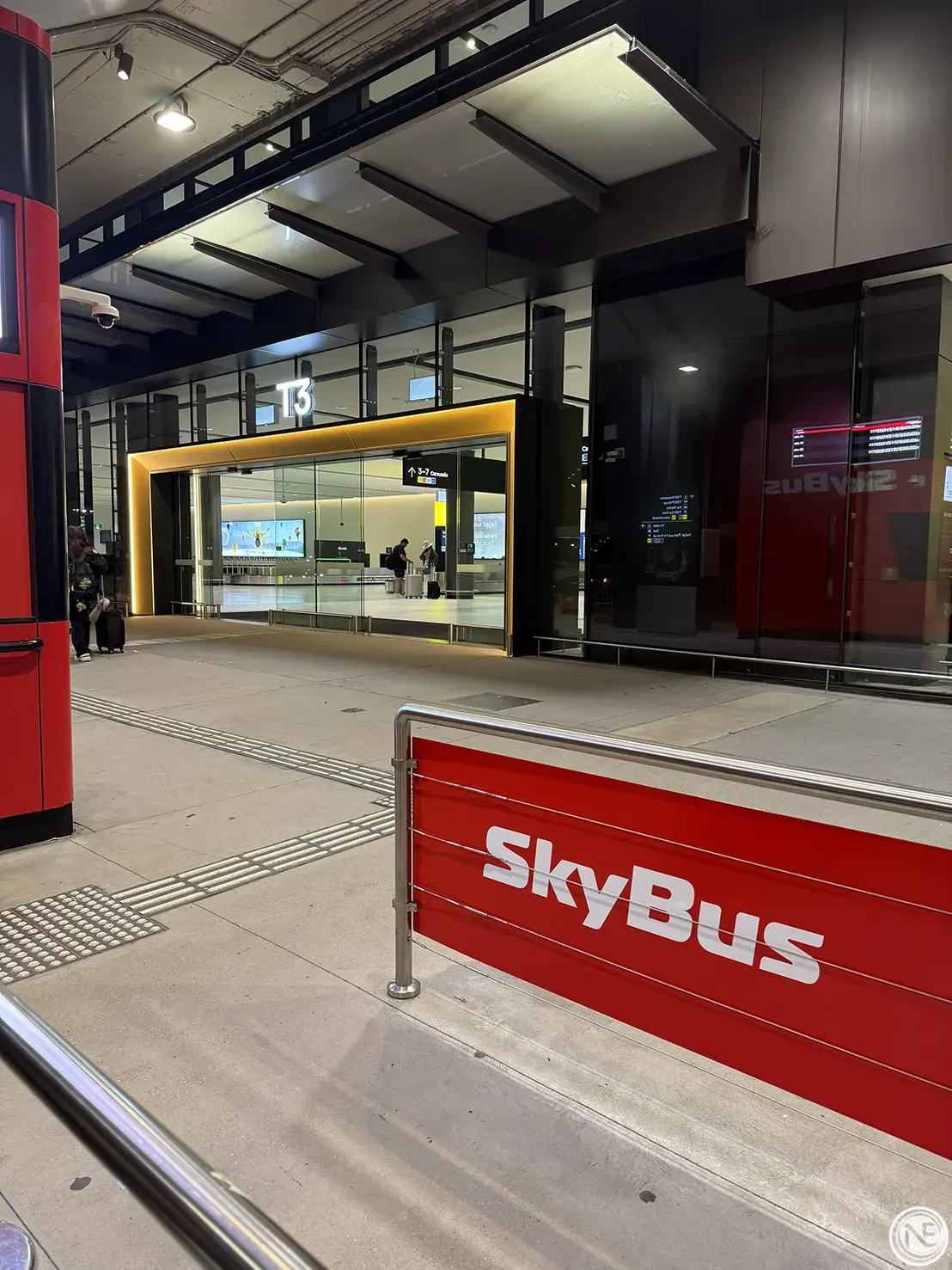 如果攜帶大件行李,從墨爾本機場(MEL)前往市區,搭乘 SkyBus 是最方便且快速的交通方式之一,車程約 30 分鐘即可直達市中心的 Southern Cross 車站。SkyBus 在機場的 T1(第一航廈)、T3(第三航廈)與 T4(第四航廈) 都設有乘車點。我們此次降落於 T2(第二航廈),出境後依指標步行約數分鐘即可抵達 T3,並找到 SkyBus 的售票機與乘車處。