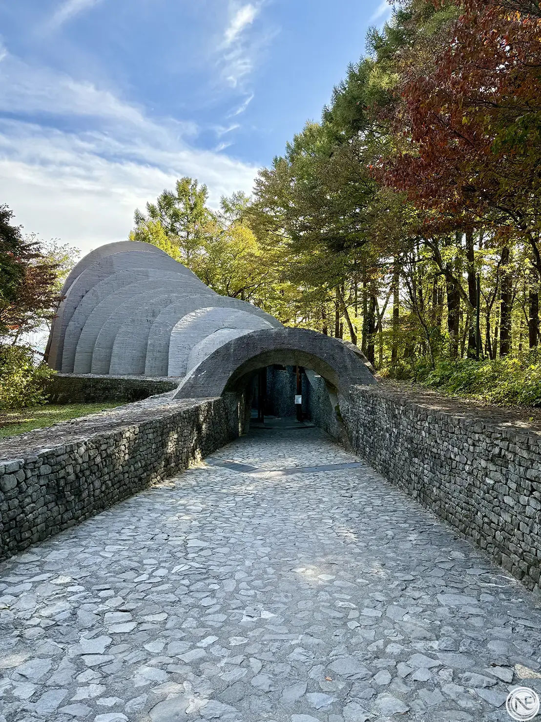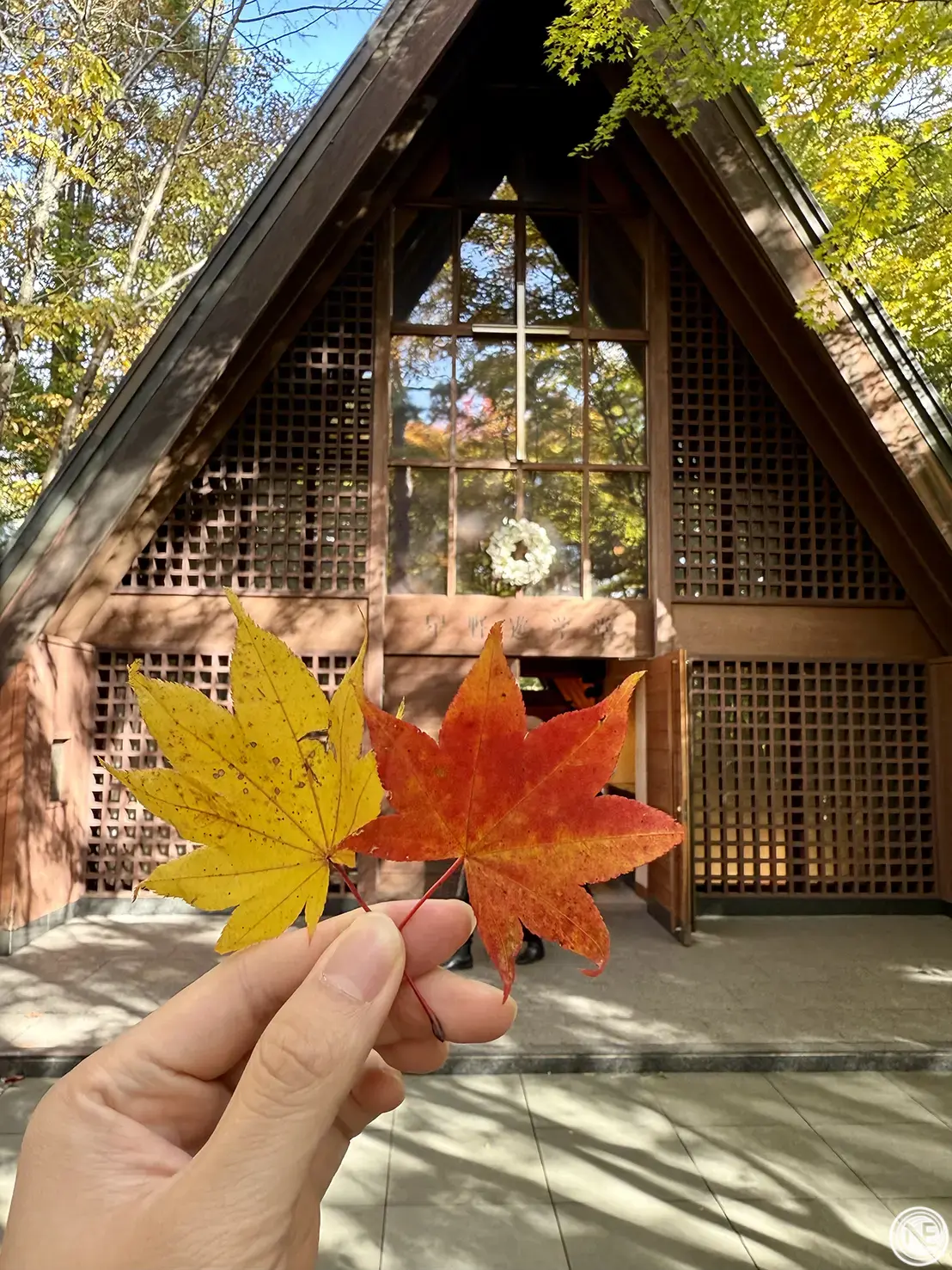 接著我們步行前往輕井澤兩座知名教堂:輕井澤高原教會與石之教會。高原教會位於靜謐的森林中,木造建築與自然景觀融為一體,氛圍靜謐莊嚴。十月底造訪時,楓葉尚未完全轉紅,但整體環境依然令人放鬆,十分適合散步拍照。距離約步行5分鐘的石之教會則是為紀念思想家內村鑑三而建,結合石材與玻璃打造出自然與信仰交融的獨特空間,陽光從縫隙灑落,營造出神聖而寧靜的氛圍。