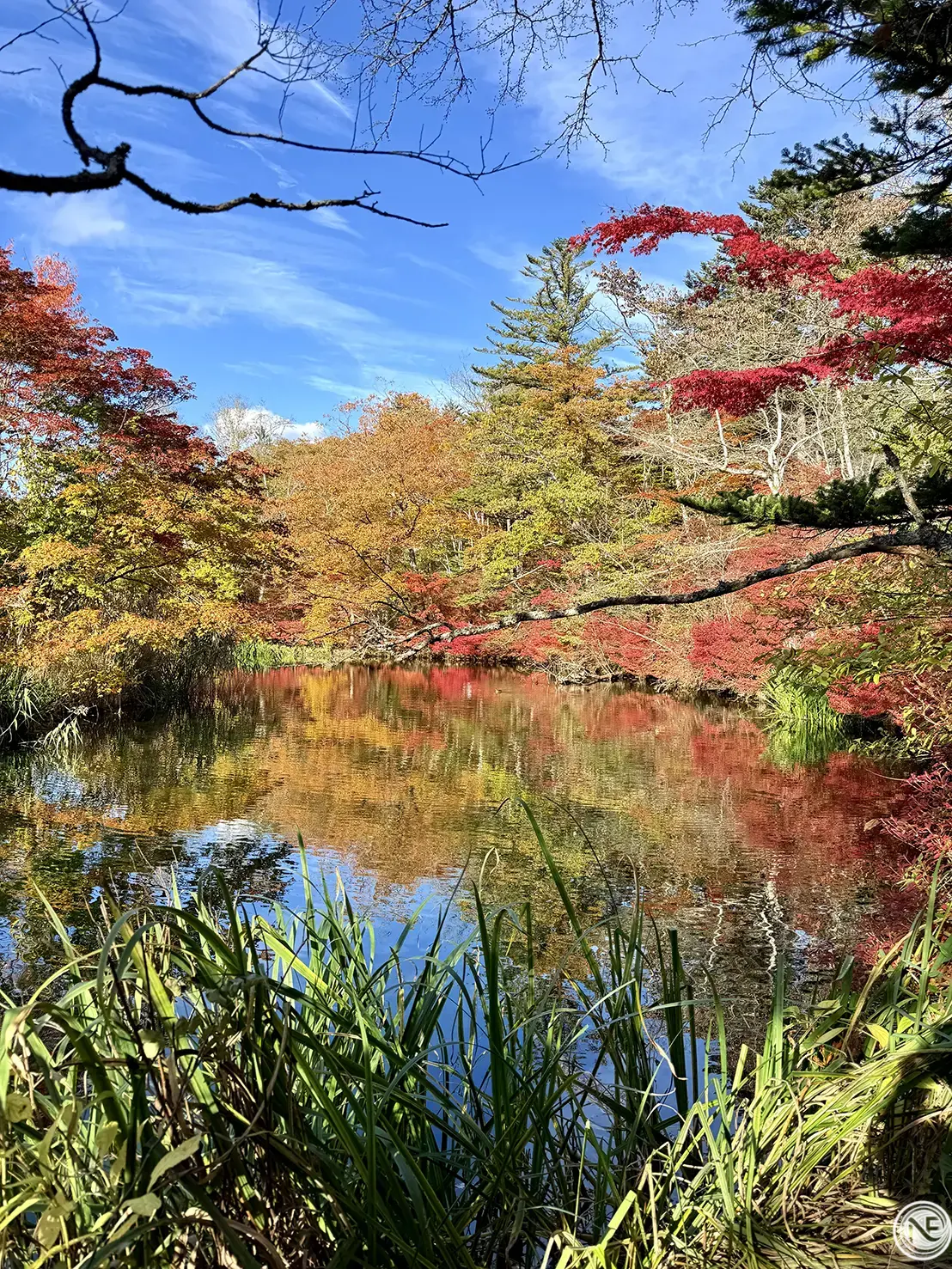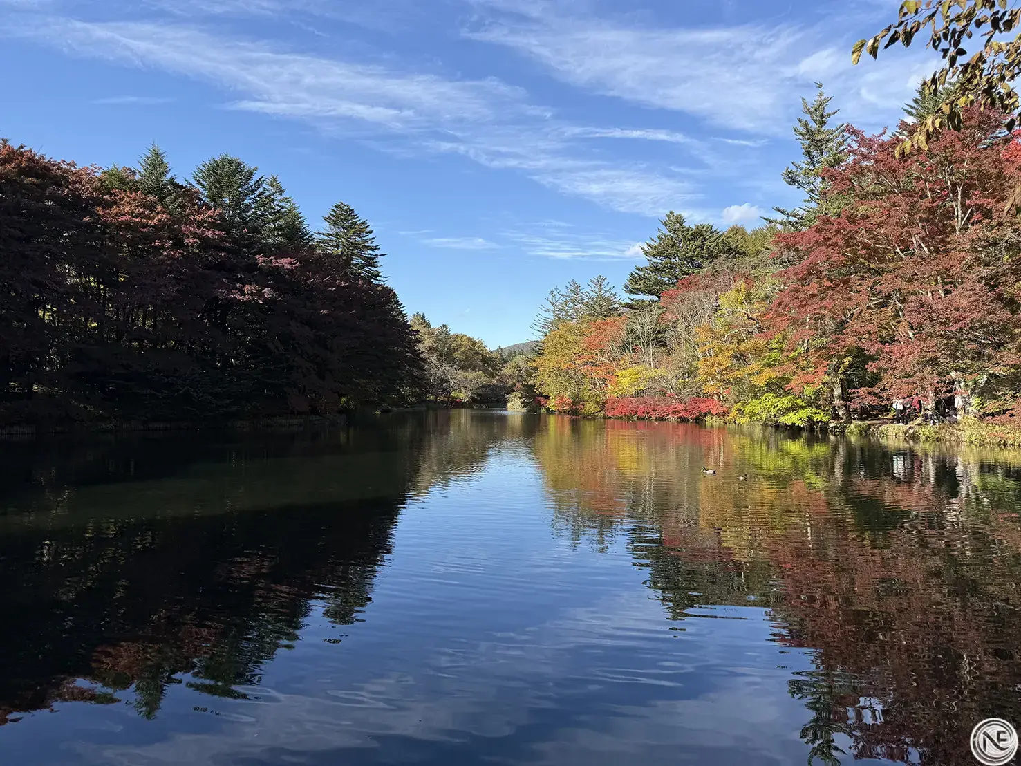 從石之教會搭乘 Uber 約 15 分鐘,我們抵達輕井澤秋季人氣景點──【雲場池】。十月底時楓葉約紅了五成,池畔倒映著紅黃交錯的樹影,風景如畫。推薦繞池一圈步道走走,沿途藏有許多攝影愛好者喜愛的取景角度,既能賞楓也能放鬆身心。整體氛圍靜謐宜人,是秋季輕井澤最不能錯過的私房景點之一。
