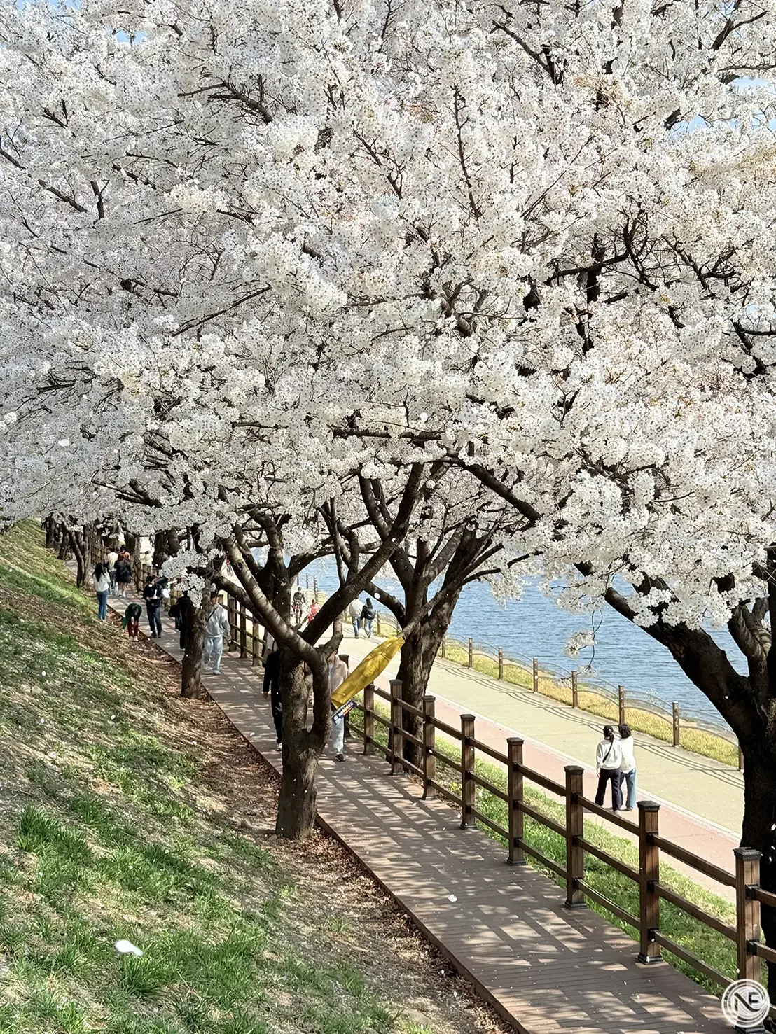 如果你喜歡邊賞櫻邊享受自然風光,那麼大邱的「峨洋橋河畔」絕對是必訪景點之一!這裡結合了河岸景色、整排盛開的櫻花樹、木棧步道與靜謐氛圍,是個能真正慢下腳步的賞花好去處。我們當天造訪時,櫻花剛好大滿開,粉嫩花朵沿著河畔延伸,搭配蜿蜒的木棧道,層次豐富、畫面感十足。坐在河岸邊的木椅上,不論是簡單野餐、放空賞花,還是靜靜聽著風聲水聲,都是一種療癒。