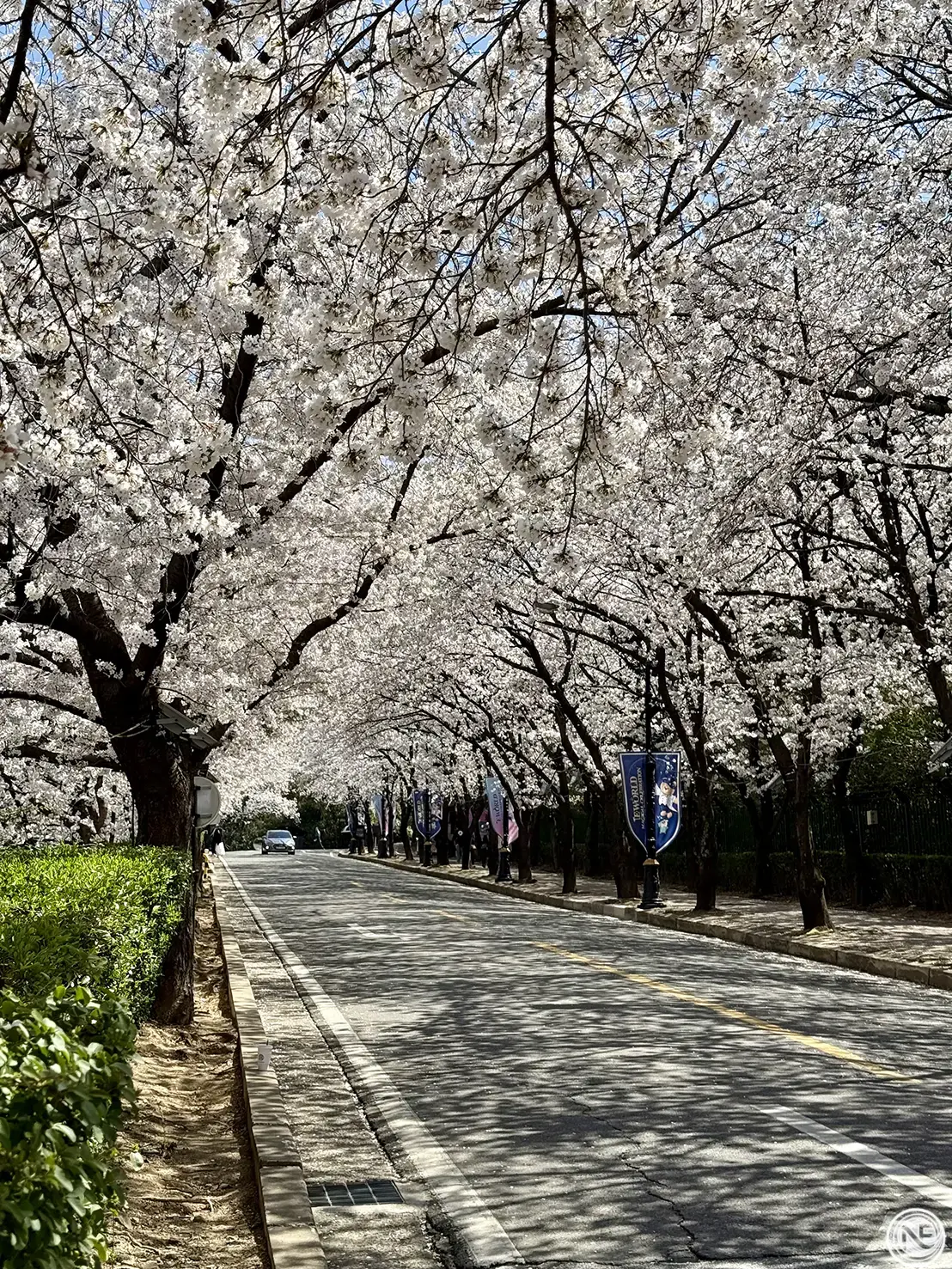 如果要選出我這趟釜山大邱賞櫻行中最讓人驚豔的景點,大邱的 E-World 絕對名列第一!園區外圍的停車場旁,就是一整條被櫻花包圍的櫻花大道,滿開時如同置身粉色隧道,美得令人屏息。最棒的是:這區完全免費,不需購票入園就能盡情拍照,CP值超高!