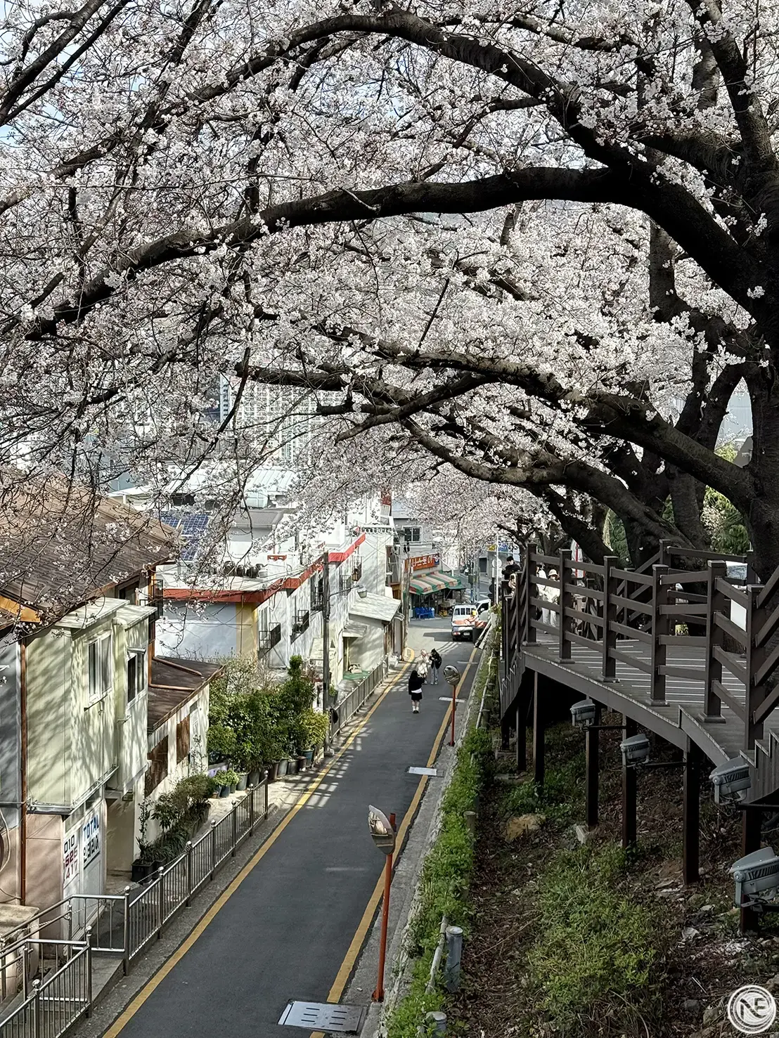 第二站我們來到超美的「開琴櫻花路」,從第一站的 cafe itti 走過來大約 20 分鐘。這裡是釜山春天超人氣的賞櫻景點之一,之前在網路上看到這裡的櫻花搭配木棧橋與屋舍的畫面,就決定這趟旅程一定要來打卡!實際走訪後真的覺得名不虛傳,滿開的櫻花在兩側綻放,走在木棧道上可以邊散步邊拍美照,整個超療癒 🌸 這裡是熱門的櫻花景點,但如果可以早點來的話人潮會相對少一些,更能享受賞櫻的浪漫氛圍~