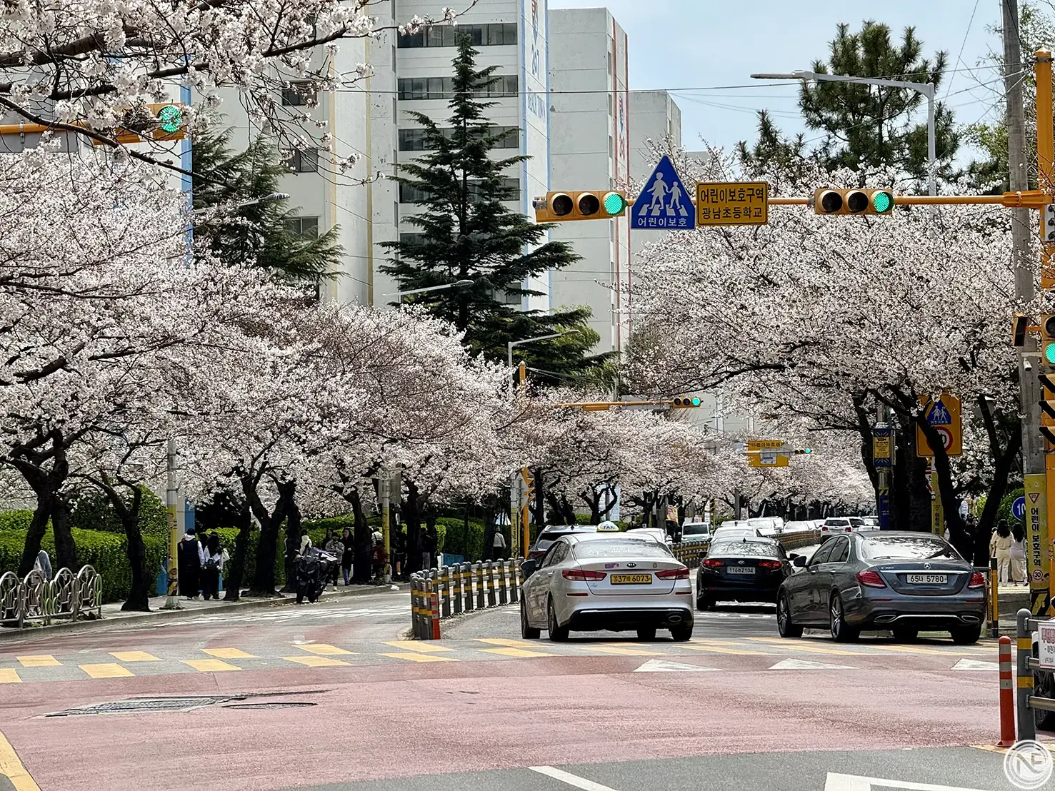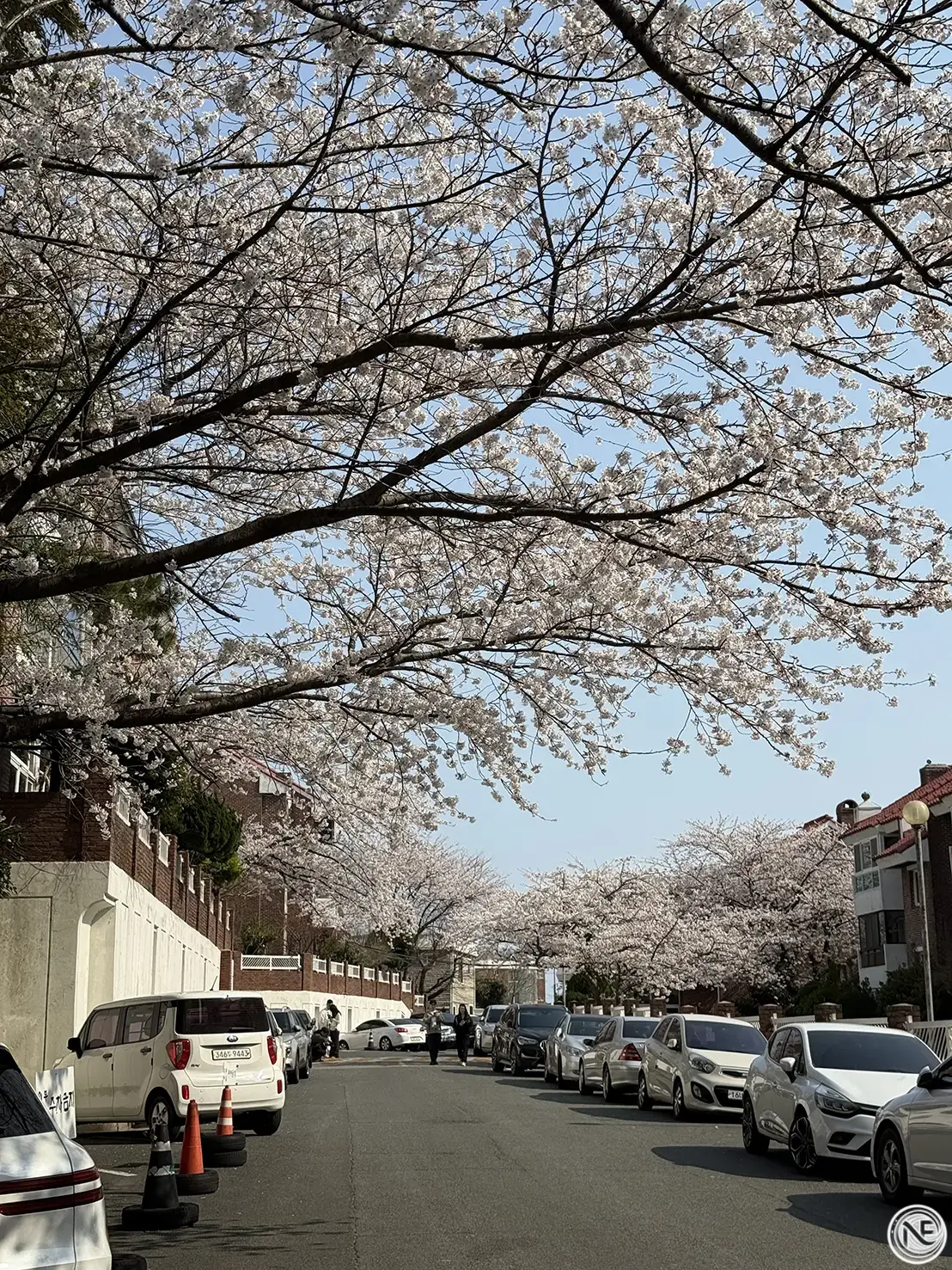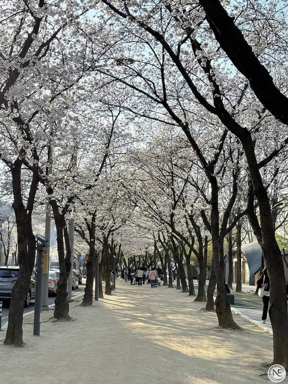 接著我們搭地鐵來到南川站,走路不久就能抵達超人氣的賞櫻景點——南川洞櫻花路!整條街道兩旁種滿櫻花樹,每到春天盛開時,整個被粉白色花海包圍的畫面真的超級夢幻~我們到的時候櫻花幾乎滿開,邊走邊被美景包圍,真的讓人忍不住一直拍照~走在櫻花樹下吹著微風,很有日系電影感。如果你是櫻花控,南川洞櫻花路絕對值得特地繞過來朝聖!