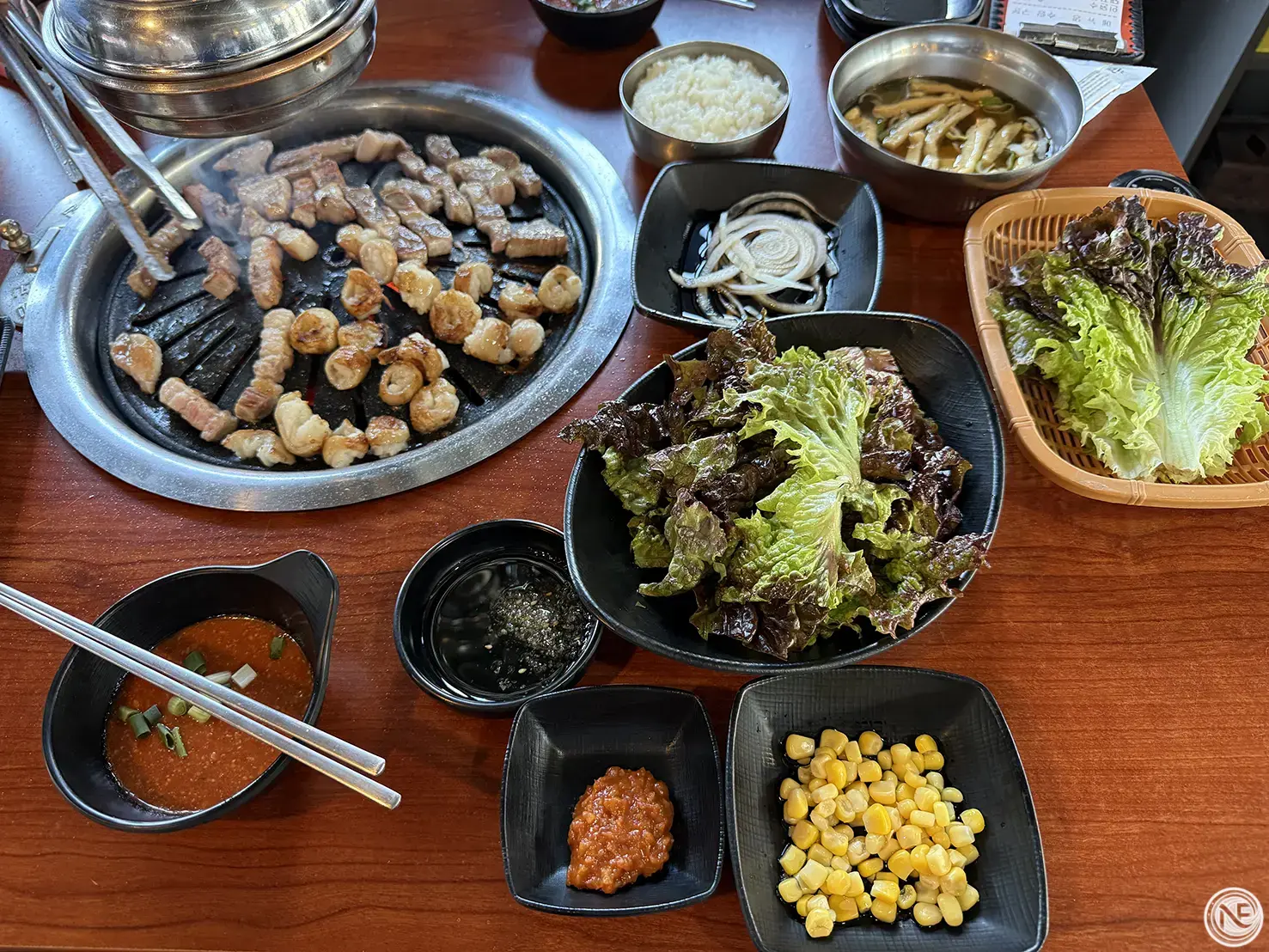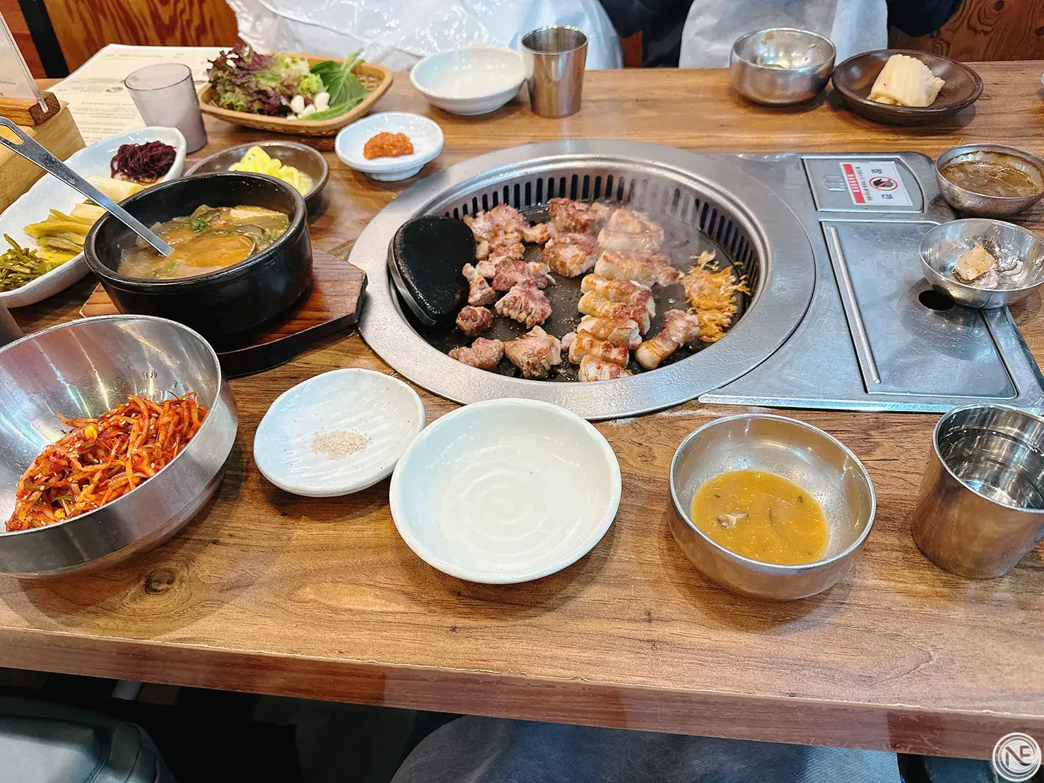 如果來釜山想吃燒肉,味贊王鹽烤肉是許多人推薦的必訪名店。我們特地在開店前就抵達排隊,順利成為第一批入場的顧客。這裡的豬五花肉質鮮嫩多汁,搭配店家提供的各式醬料與生菜一起享用,風味層次豐富,真的蠻好吃的!雖然店內油煙稍重,但店家有貼心提供罩子蓋住包包與衣物,整體來說還是非常地推薦。