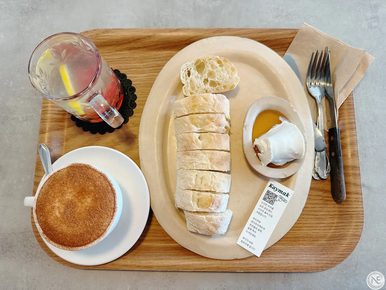 這間位於青沙浦DIART Coffee 非常熱門,我們大約中午時分抵達,幸運地剛好有空位。這裡的招牌甜點是在韓國相當流行的土耳其奶油甜點「Kaymak」,厚厚一層濃郁奶香的 Kaymak 抹在麵包上,入口滑順又帶有層次感,香濃到讓人罪惡感爆棚,熱量應該不低,但真的蠻好吃的!再搭配大片玻璃窗望向湛藍海景,難怪會成為青沙浦的人氣打卡景點。