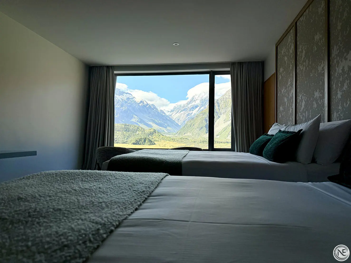 走完 Hooker Valley Track 後,我們回到飯店辦理入住,這次在庫克山選擇的是廣受好評的 The Hermitage Hotel。我們透過官網預訂了 Premium Plus Queen Queen 房型(含早餐),最大的亮點就是——房間內就能透過大片觀景窗欣賞庫克山的壯麗景色,在床上就能看山,實在太幸福了!
