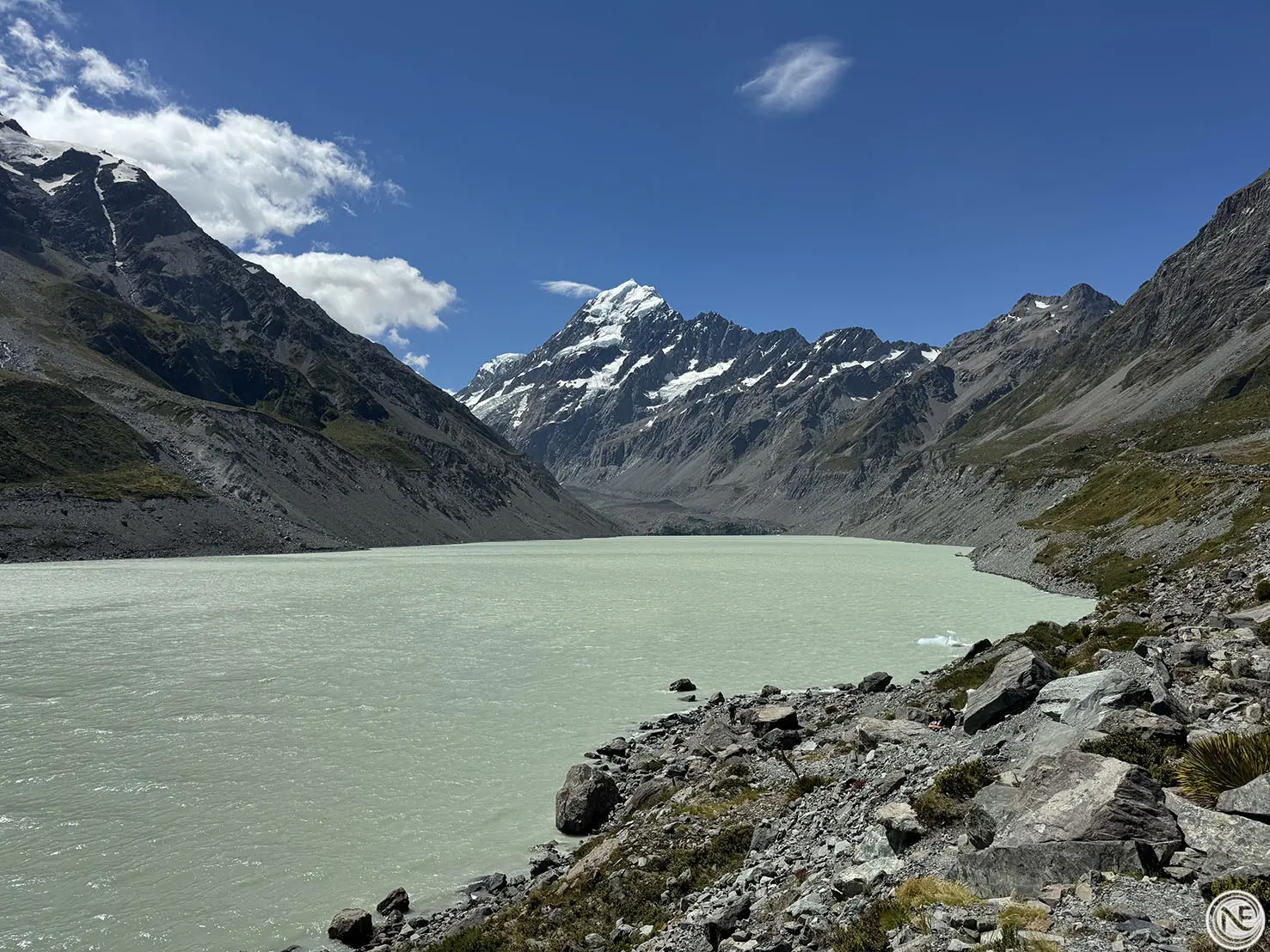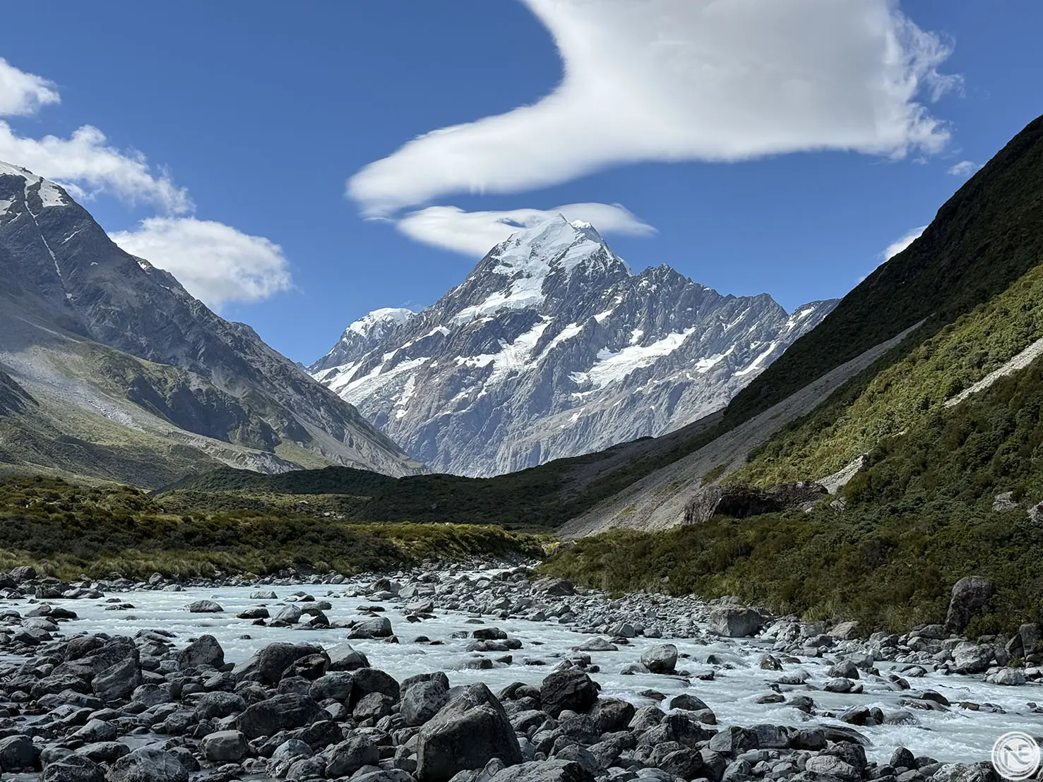 這條步道來回約需 3.5 小時,建議出發前先使用停車場的洗手間,雖然途中也有設置公廁,但旺季常需排隊。整段路程坡度平緩、路況良好,不過如果平常沒在運動,還是會覺得有點吃力。沿途會經過三座吊橋,風景壯闊,最後可抵達湖邊欣賞漂浮著冰塊的 Hooker Lake,遠眺庫克山的畫面真的讓人震撼,絕對值得一走!