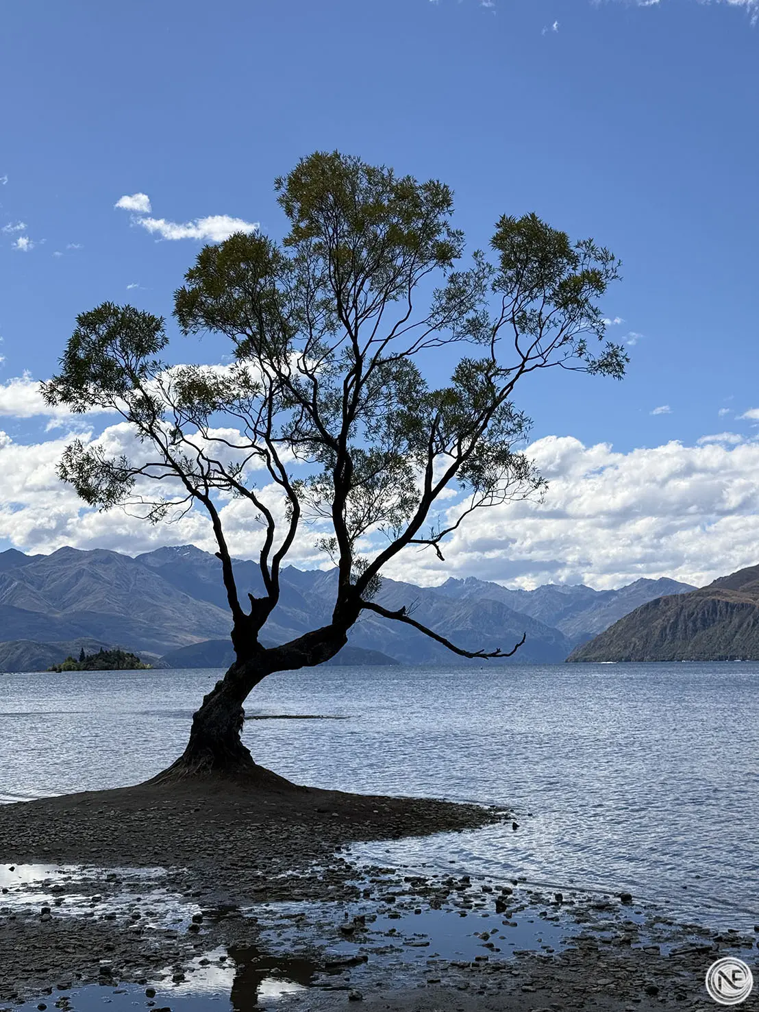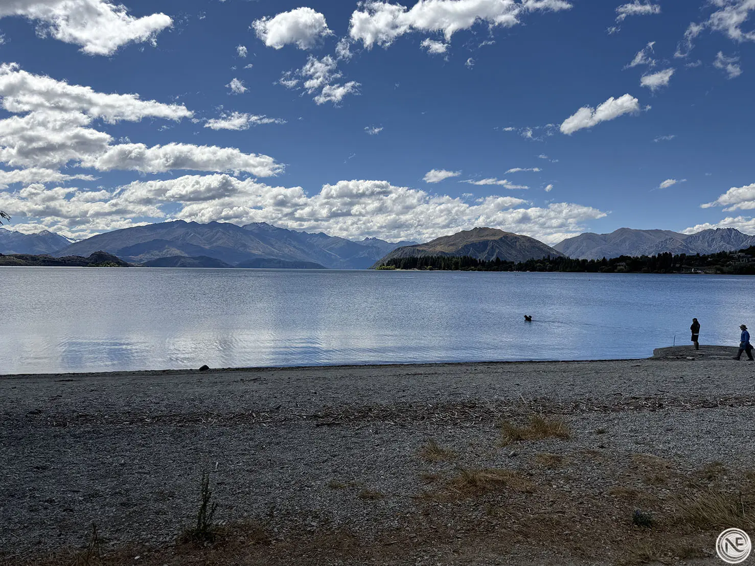 在住宿處放好行李後,我們便前往瓦納卡湖畔散步。當天天氣極好,湛藍的天空與清澈的湖水相互輝映,沿途風景美得令人屏息,是那種會永遠留存在記憶中的畫面。沿著湖邊走了一段後,我們來到了知名的 That Wānaka tree(孤獨的樹)。這棵長在湖中的孤樹,靜靜地立於水面,展現出一種獨特的孤寂美感。現場有不少旅人駐足拍照,每個角度都能感受到這棵樹帶來的靜謐與詩意。
