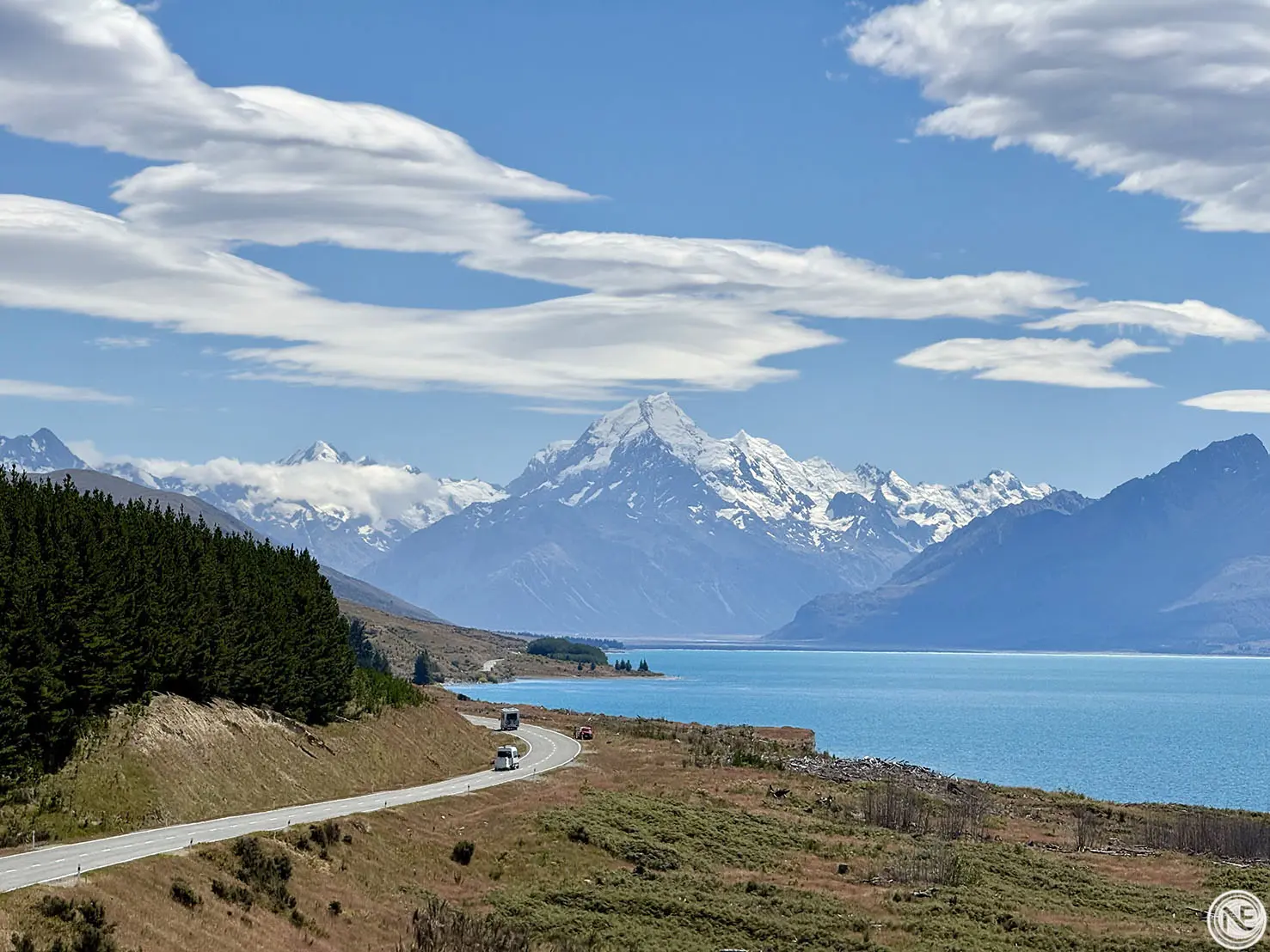 從 Lake Pukaki 前往庫克山的途中風景如畫,而Peter's Lookout 是這段旅程中不可錯過的觀景點。站在這裡可以一次收進壯麗的三重景色:湛藍的湖水、蜿蜒的公路,以及遠方巍峨的庫克山雪峰,畫面如明信片般夢幻。這裡設有停車場,方便旅人短暫停留,不論是拍照打卡或稍作休息,都是絕佳的中繼點。